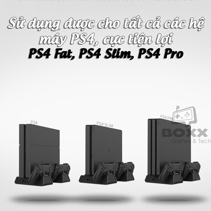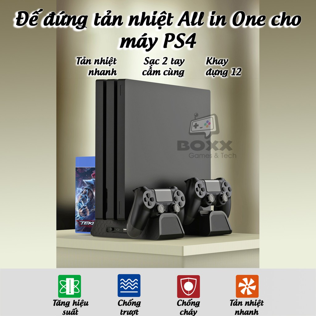 Đế đứng tản nhiệt cho máy PS4 kèm dock sạc tay cầm, khay đựng đĩa, chân đế làm mát máy PS4 All in OneDùng được cho tất cả các hệ máy của PS4 : PS4 Fat, PS4 Slim, PS4 Pro.