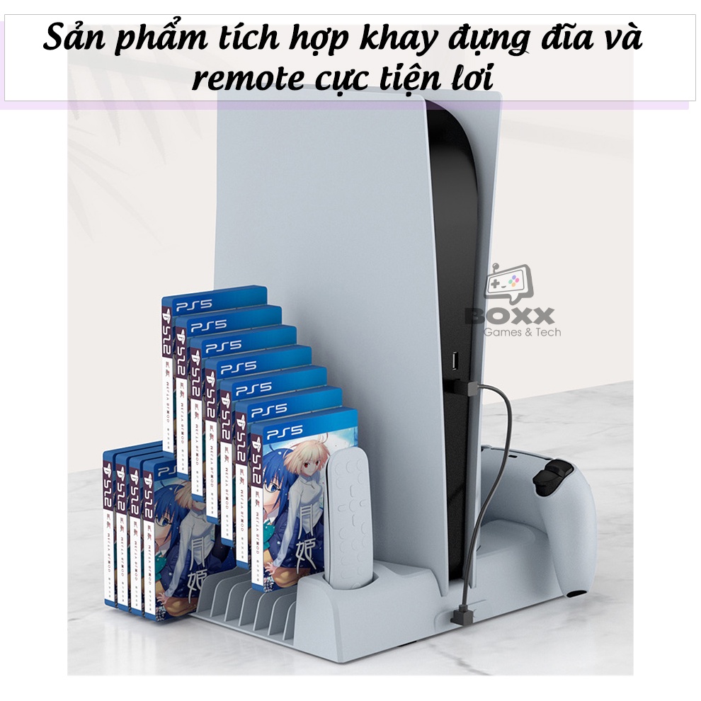 - Sản phẩm tích hợp chân đế dựng đứng cho máy PS5 , tích hợp khả năng sạc cùng lúc 2 tay cầm, và khay đĩa cho khả năng cất được 11 đĩa cùng lúc.