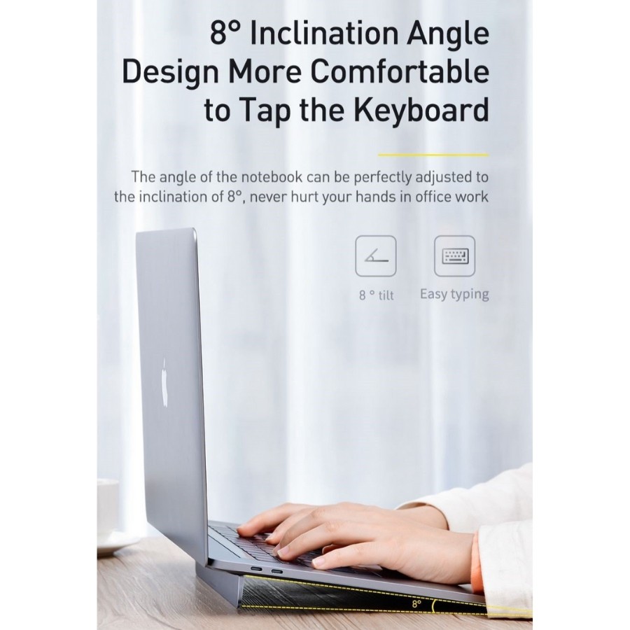 - Đế tản nhiệt siêu mỏng Baseus Papery Notebook Holder có thiết kế dạng bản lề vô cùng thông minh và tiện dụng có thể đóng/ mở tiện dụng . Khi mở ra có tác dụng tăng hiệu quả thoát nhiệt cho đế Laptop/ Macbook , thay đổi góc nghiên của bàn phím và màn hình so với mặt bàn khoảng 8 độ giúp cho thao tác sử dụng và ghỏ phím được thuận tiện và thoải mái hơn . Giảm thiểu tiếp xúc giữa đế máy và mặt bàn giúp hạn chế trầy xước thân máy .
