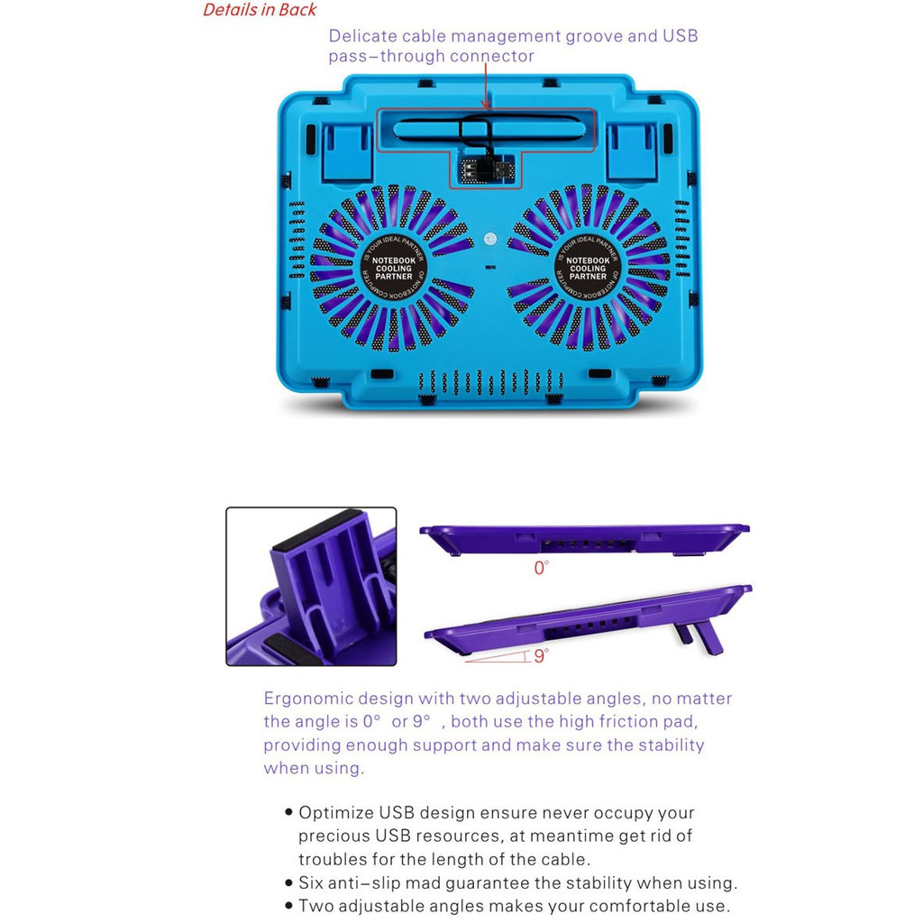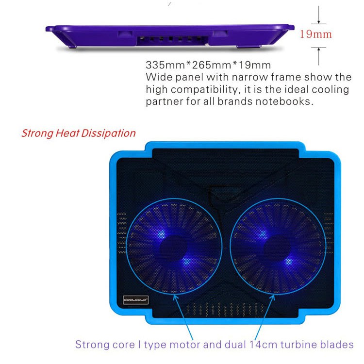 Thiết kế mạnh mẽ, kết hợp đèn Led màu xanh, lưới kim loại chống trượt cực tốt. Đế Tản Nhiệt COOLCOLD được kết nối đơn giản và lấy năng lượng thông qua cổng USB. Rất tiện lợi, không vướng víu khi di chuyển.