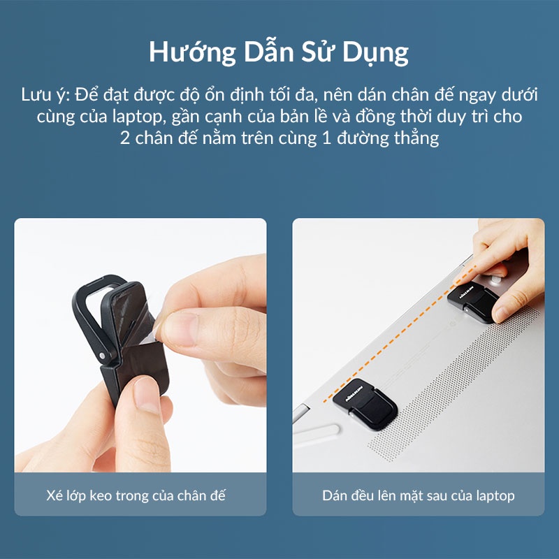 📢📢📢 Để đạt được độ ổn định tối đa, nên dán chân đế ngay dưới cùng của laptop, gần cạnh của bản lề và đồng thời duy trì cho 2 chân đế nằm trên cùng 1 đường thẳng 📢📢📢