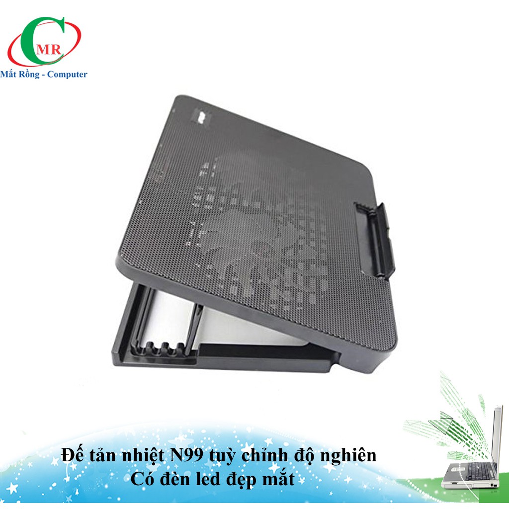 Đế tản nhiệt N99 có thể tuỳ chỉnh độ nghiên nhiều cấp độ, dùng được cho Laptop 14 inch -17 inchĐế có bề mặt lưới thoáng mát, kết hợp với 2 cánh quạt tản nhiệt nhanh hơn