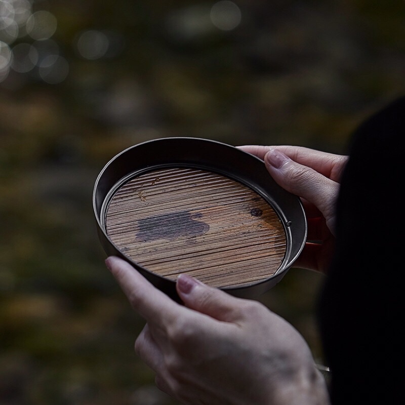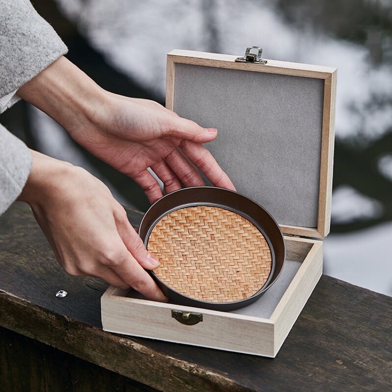 Đế( thuyền) để ấm trà.—Chất liệu: Thép+ lót Tre thủ công.
