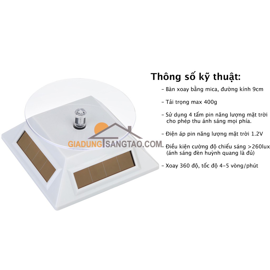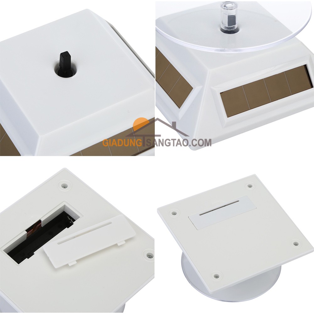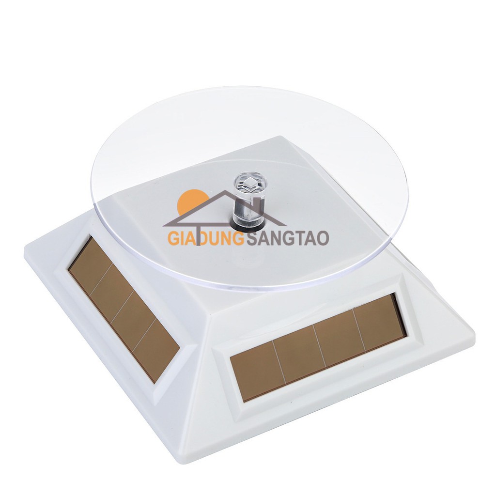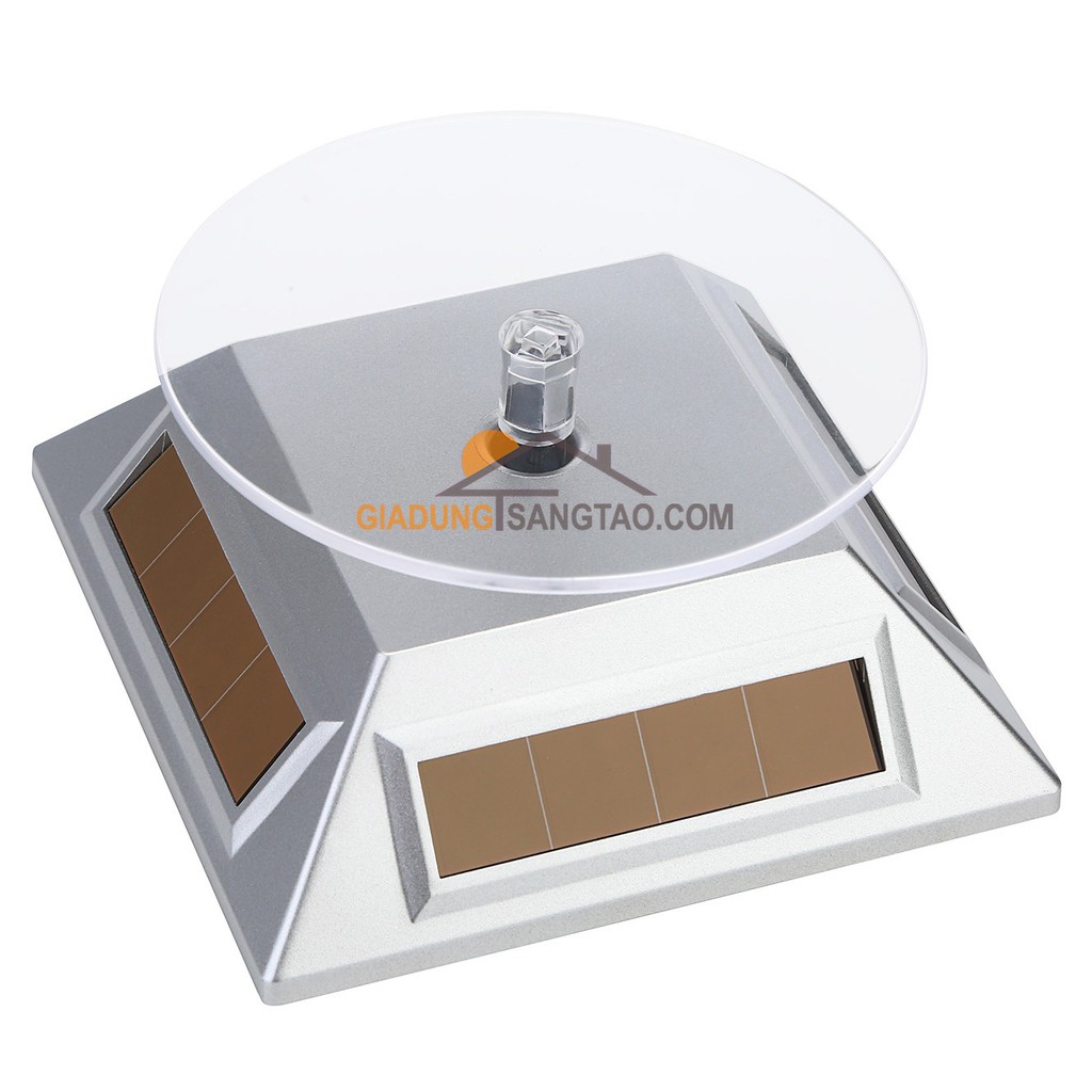 Đế xoay trưng bày sản phẩm năng lượng mặt trời M1Đế xoay dùng để trưng bày, giới thiệu sản phẩm tới khách hàng. Sản phẩm hoạt động bằng năng lượng mặt trời với cường độ chiếu sáng >260lux là có thể hoạt động (ánh sáng đèn huỳnh quang là đủ). Hoặc có thể dùng pin vào ban đêm, khu vực thiếu sáng.