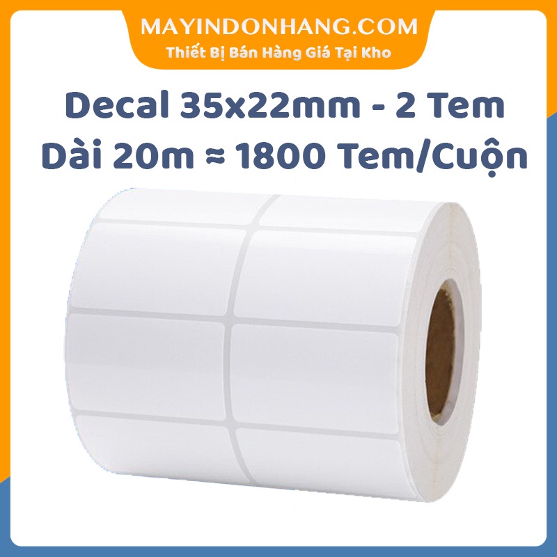 Giấy decal nhiệt 2 tem/hàng, in tem nhãn mã vạch (in nhiệt trực tiếp, không cần mực), cỡ tem 35x22 mm (ngang x cao), khổ giấy 74mm, dài 20m (1.840 tem/cuộn), đường kính cuộn giấy 80mm, Ø lõi 33mm.Tương thích