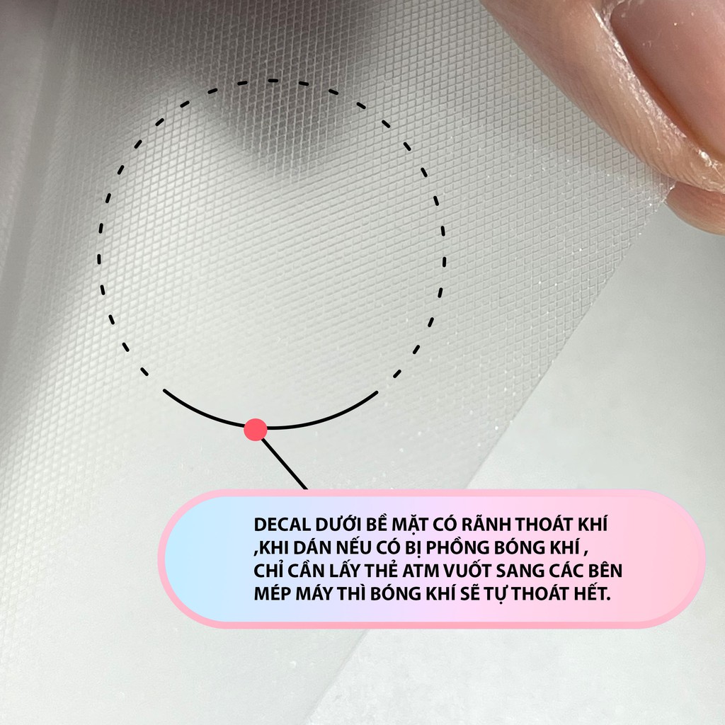 - Decal với công nghệ rãnh khí dưới bề mặt giúp khách hàng cực ký dễ dán , khi dán bị phồng bóng khí chỉ cần lấy tay hoặc tẻ ATM vuốt ra các mép máy không khí sẽ thoát hết ra ngoài. Đây là đặc điểm xịn xò nhất của loại decal này so với các loại decal kém chất lượng khác trên thị trường ( loại thường , kém chất lượng rất khó dán dễ để lại bóng khí trên bề mặt khi dán - khách hãy tìm hiểu kỹ các loại decal ở shop khác truoc khi mua hàng)