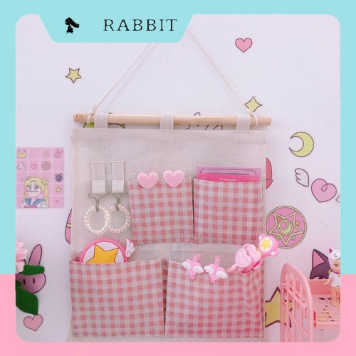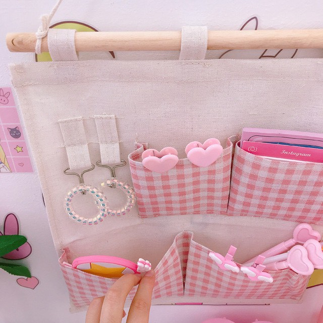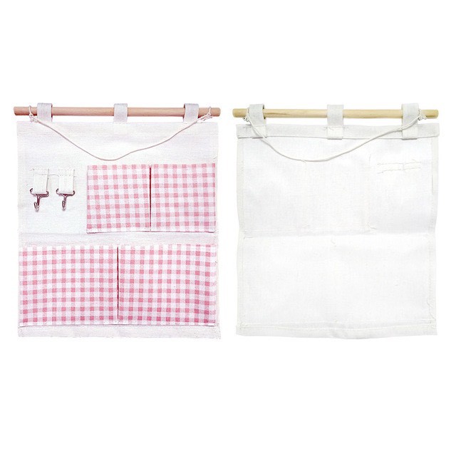 Giá decor treo nền trắng, kích cỡ 30,5cm * 32cmGiá treo gồm 2 móc treo ở góc trái, 4 túi hồng caro với 2 túi nhỏ và 2 túi to để đựng đồ