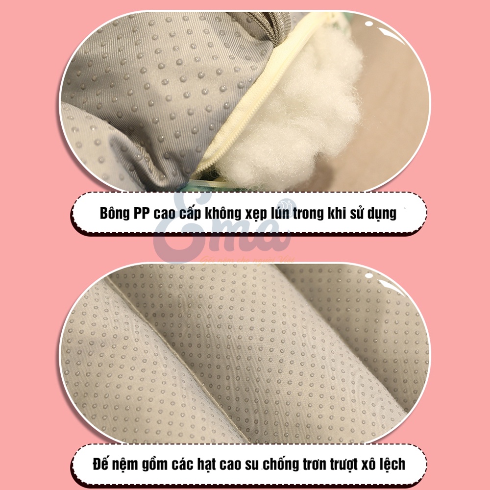 - Vỏ đệm: làm từ vải nhung mát êm mềm, không gây kích ứng da. Đặc biệt mặt bên gối có thêu nổi họa tiết hình thú dễ thương.