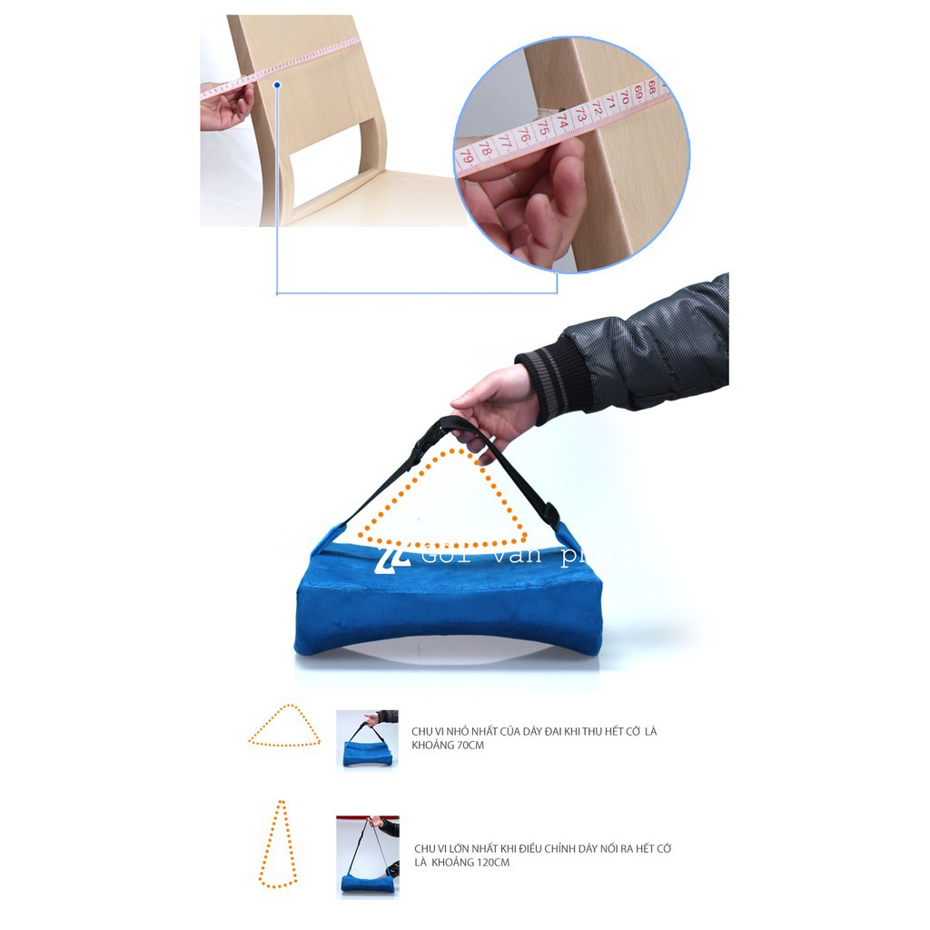 +Dây đai thông minh tùy chỉnh kích thước vòng ôm giúp gối ôm khít với mọi loại ghế to nhỏ khác nhau. Từ ghế nhân viên cỡ nhỏ tới ghế giám đốc cỡ lớn hoặc ghế ô tô.