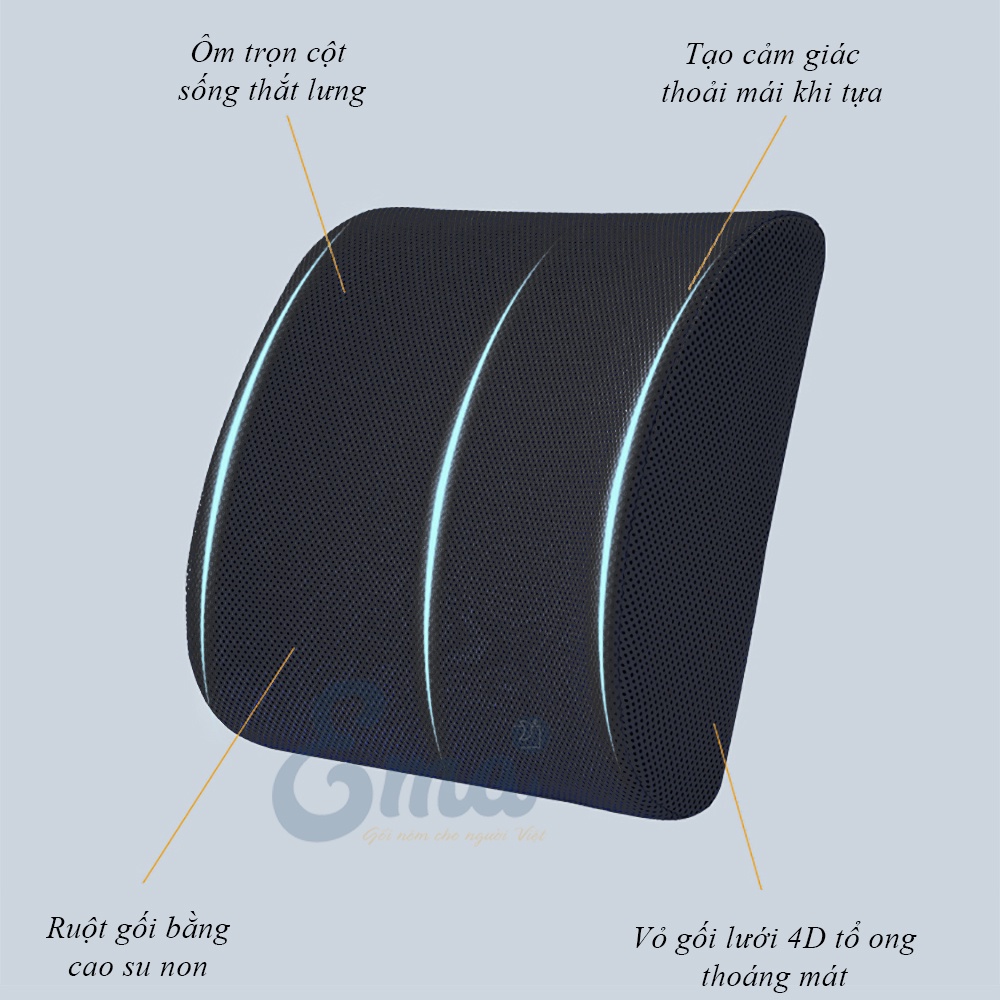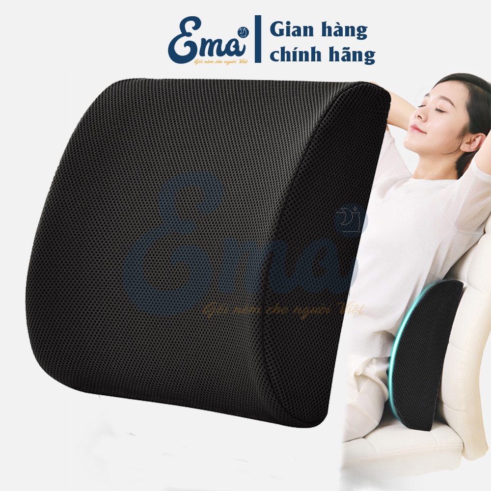 - Gối tựa lưng Ema được thiết kế phù hợp với vóc dáng người Việt Nam, mặt cong của gối sẽ ôm trọn cột sống thắt lưng đồng thời tạo tư thế ngửa lưng thư giãn thoải mái. Vỏ gối được may từ chất liệu lưới 3D giúp tăng khả năng thoát nhiệt và tạo cảm giác Massage.