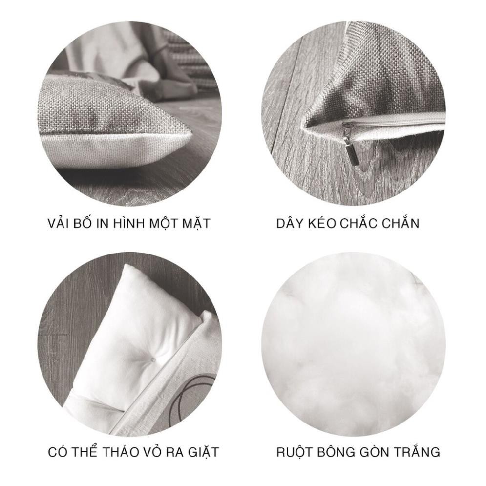 + Chất liệu Vỏ vải bố in hình 1 mặt , ruột đệm bông gòn trắng.