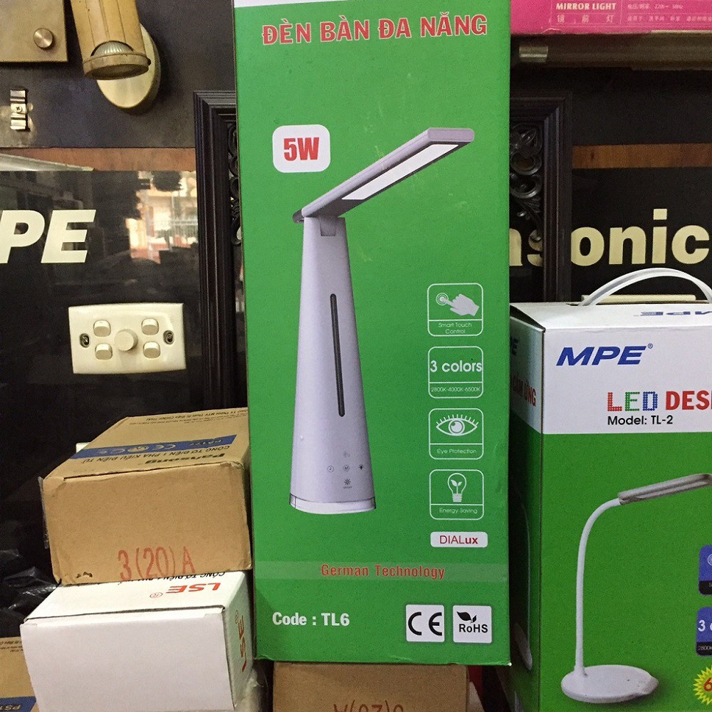 ĐÈN BÀN LED CAO CẤP MPE TÍCH HỢP QUẠT,USB,3 CHẾ ĐỘ SÁNG,PHÍM CẢM ỨNGCông suất: 5WQuang thông: 270 lmNhiệt độ màu (CCT): 6500K-3000K-4000K. Đèn có 3 chế độ màu: trắng, vàng,trung tính. Ánh sáng liên tục, không nhấp nháy, tốt cho thị lực.Nút điều khiển cảm ứng điện dungTính năng: hẹn giờ tắt (đếm ngược 40 phút), lọc không khí3 tốc độ quạt không cánhCông suất định mức quạt: 3.5Bộ nguồn: Đầu vào - AC100-240V-50/Hz. Đầu ra - DC 12V-2AĐế đèn có đèn LED chuyển màu RGB - 8 chế độ sángChế độ tự động tắt đèn chínhĐộ rọi tối đa: >750LUX (đo từ khoảng cách 36 cm)Thân đèn tích hợp 2 cổng sạc USB: 5V 2.4ATiêu chuẩn châu Âu CE - RoHSĐiện áp: 220VAC Số lượng LED: 60 conMPE Table Led Lamp TL6 size: 382mm x 100mm x 400mmQuy cách đóng gói: 1 cái/hộp - 6 cái/thùng HƯỚNG DẪN SỮ DỤNGKết nối bộ nguồn với đèn và nguồn điện phù hợp và làm theo các hướng dẫn sau:1. Nhấn nhanh phím để bật/ tắt, nhấn lâu để điều chỉnh độ sáng của đèn chính.2. Nhấn nhanh phím để thay đổi nhiệt độ màu của ánh sáng chính.3. Nhấn phím để mở quạt gió. Lưu ý quạt gió có 2 tốc độ.4. Nhấn và giữ phím đèn chính sẽ nhấp nháy 2 lần, xác nhận bộ hẹn giờ đã mở. Sau 40 phút đèn chính sẽ tự tắt. Lưu ý quạt và đèn nền ở đế không tự tắt.5. Nhấn nhanh phím để mở đèn nền ở đế.Giá SLX