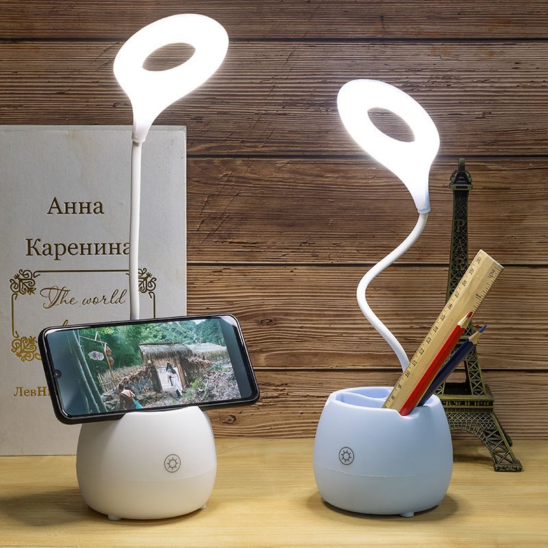 - Đèn bàn có ngăn gim bút thước, đồng thời là giá đỡ điện thoại tiện dụng