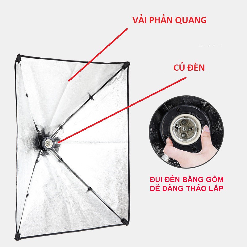- Chụp đèn với lớp bạc bên trong giúp tập trung ánh sáng tốt hơn, sáng hơn kích thước 50x70xm. Phía bên ngoài viền có lớp vải dán để dính tấm softbox.