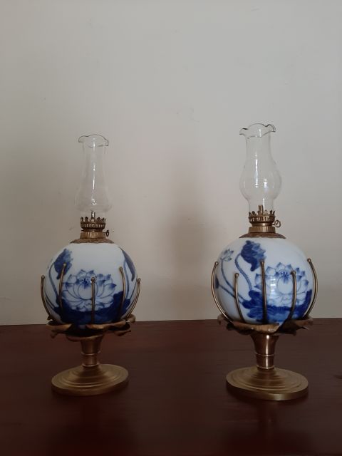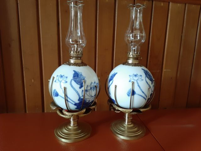 Đèn dầu gốm sứ họa tiết sen tràm màu lam cổ bọc đồng.Chiều cao: 31cm cả bóng