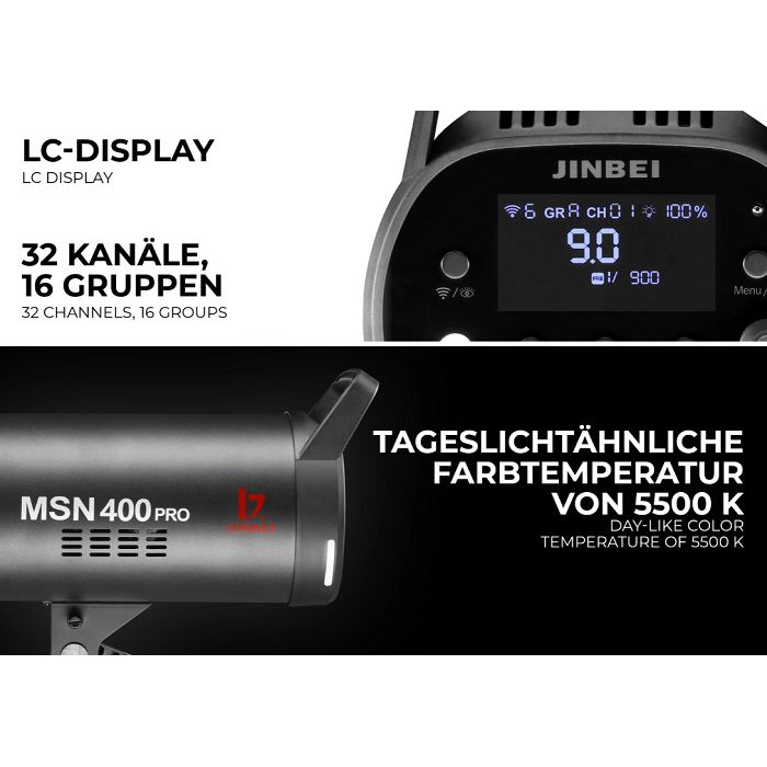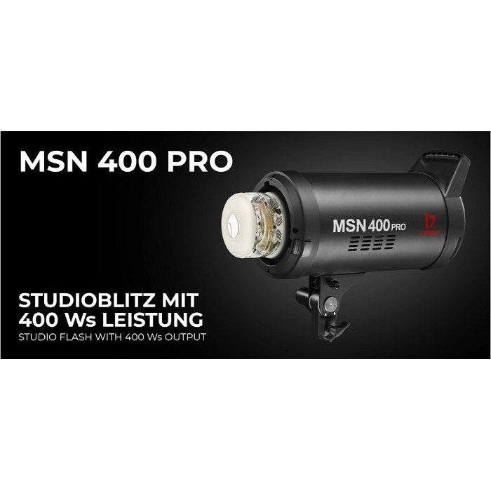 Đèn flash Jinbei MSN 400 Pro là đèn flash studio dành cho các nhiếp ảnh gia chuyên nghiệp. MSN 400 pro tương thích với các máy ảnh Canon, Sony, Nikon, Fuji, Panasonic, Olympus. Jinbei MSN 400 Pro cấp thời gian ghi lên đến 1/ 56.000 giây ở chế độ đóng băng và thời gian tái chế tối đa 0,7-0,9 giây, theo đó 32 kênh và 16 nhóm có thể được kiểm soát. Nhiệt độ màu không đổi 5500k ± 100K thích hợp chụp ảnh chân dung, ảnh thời trang, ảnh chuyển động, ảnh quảng cáo.THÔNG SỐ KỸ THUẬT: