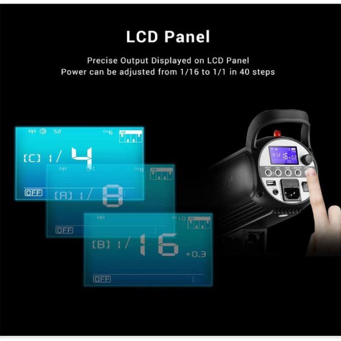 👍: Đèn có thời gian tái chế 0,1 đến 1 giây với thời lượng chớp tắt là 1/2000 giây. Đèn có thể điều chỉnh ánh sáng từ 5-100% thông qua màn hình LCD hoặc điều kiển từ xa.