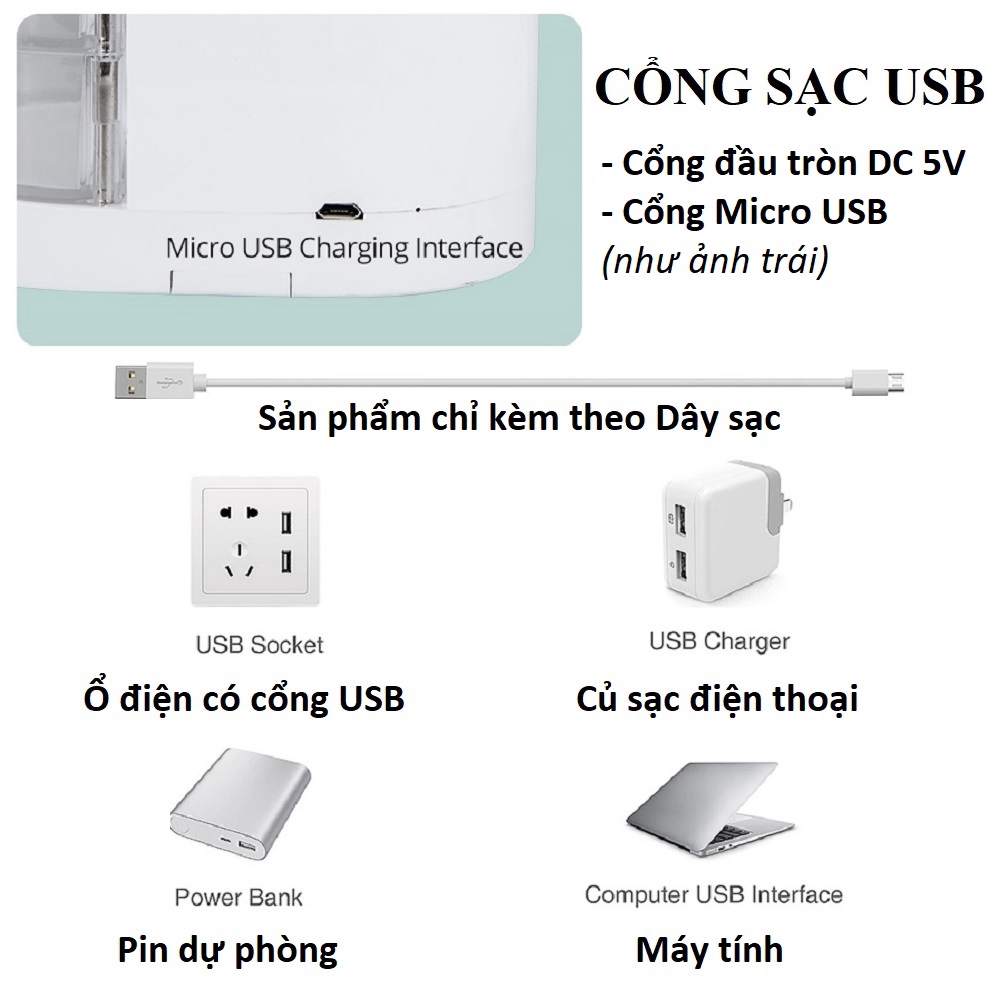 -Nguồn điện: Cổng sạc USB (Củ sạc, Pin dự phòng, Cổng máy tính). Chú ý: Sản phẩm được bán không bao gồm Củ sạc.