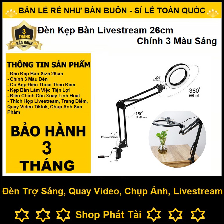 Đèn Kẹp Bàn 26cm - Điều Chỉnh 3 Chế Độ Sáng, Tặng Kèm Kẹp Điện Thoại Livestream, Quay Video, Make Up, Quay Tiktok
