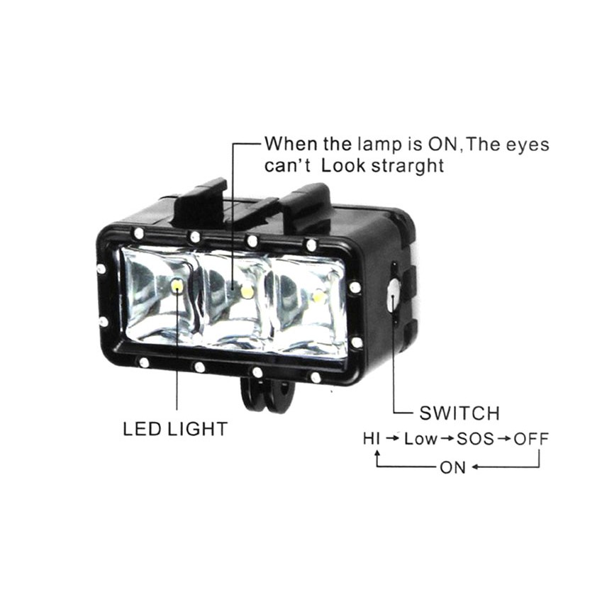 Đèn LED chống nước cho camera hành động GoPro, Sjcam, Yi Action, Osmo Action- Đèn gồm 3 bóng đèn LED siêu sáng với độ sáng 300 lumen.