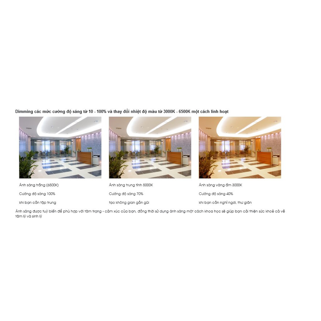 - Điều chỉnh cường độ sáng từ 10 - 100% và thay đổi màu sắc ánh sáng ( nhiệt độ màu từ 3000K - 6500K ) một cách linh hoạt -> Ánh sáng được tuỳ biến để phù hợp với tâm trạng - cảm xúc của bạn, đồng thời sử dụng ánh sáng một cách khoa học sẽ giúp bạn cải thiện sức khoẻ cả về tâm lý và sinh lý