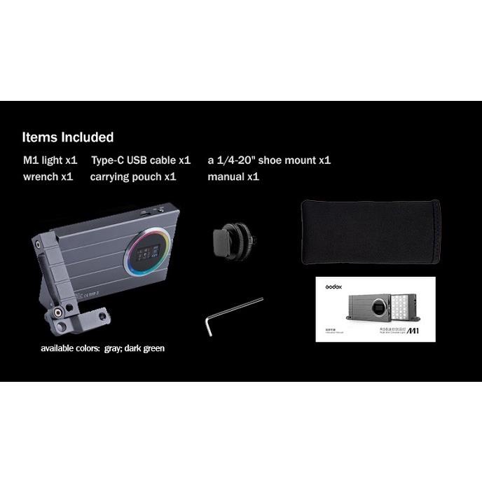 Đèn led Godox M1 RGB có kích thước bỏ túi cho phép bạn điều chỉnh màu sắc và độ bão hòa từ 360 màu khi ở chế độ RGB và nhiệt độ màu có thể điều chỉnh từ 2500 đến 8500K để phù hợp với nguồn sáng xung quanh. Ngoài ra còn có 15 chế độ hiệu ứng đặc biệt và 40 cài đặt trước giúp tăng thêm tốc độ và sự sáng tạo cho cảnh quay của bạn. Godox M1 có CRI cao là 97 đảm bảo màu sắc hiển thị tự nhiên và chính xác.THÔNG SỐ KỸ THUẬT GODOX M1: