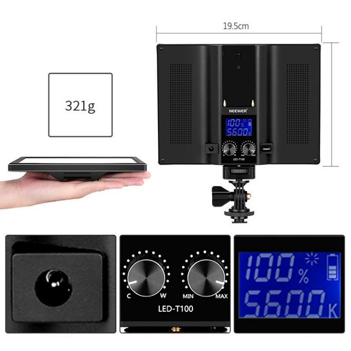 Đèn led quay phim chụp ảnh Neewer T100 được làm bằng chất liệu cao cấp, bền đẹp cho thời gian sử dụng dài lâu. Độ sáng điều chỉnh cho phép cho chính xác, không nhấp nháy sáng lập để đạt được mong muốn của bạn chiếu sáng đầu ra. Có thể điều chỉnh nhiệt độ màu này dao động từ 3200 đến 5600K có thể được điều khiển bởi một Dimmer núm. Được trang bị với một màn hình hiển thị LCD rõ nét màn hình, nó có thể thể hiện thông tin sản phẩm độ sáng, nhiệt độ màu.THÔNG SÔ KỸ THUẬT: