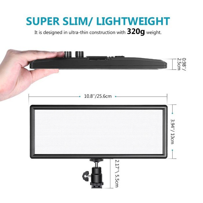 Đèn led quay phim chụp ảnh Neewer T120 được thiết kế siêu mỏng xây dựng với tiết kiệm năng lượng bóng đèn Led đặt đều bên trong với CRI cao. Được làm bằng chất liệu cao cấp, bền đẹp cho thời gian sử dụng dài lâu. Độ sáng điều chỉnh cho phép cho chính xác, không nhấp nháy sáng lập để đạt được mong muốn của bạn chiếu sáng đầu ra. Có thể điều chỉnh nhiệt độ màu này dao động từ 3200 đến 5600K có thể được điều khiển bởi một Dimmer núm. Được trang bị với một màn hình hiển thị LCD rõ nét màn hình, nó có thể thể hiện thông tin sản phẩm độ sáng, nhiệt độ màu. Sản phẩm được phân phối trên toàn quốc bởi thietbiquayphim.com.THÔNG SÔ KỸ THUẬT: