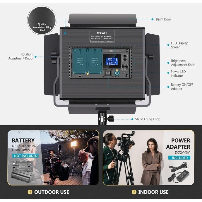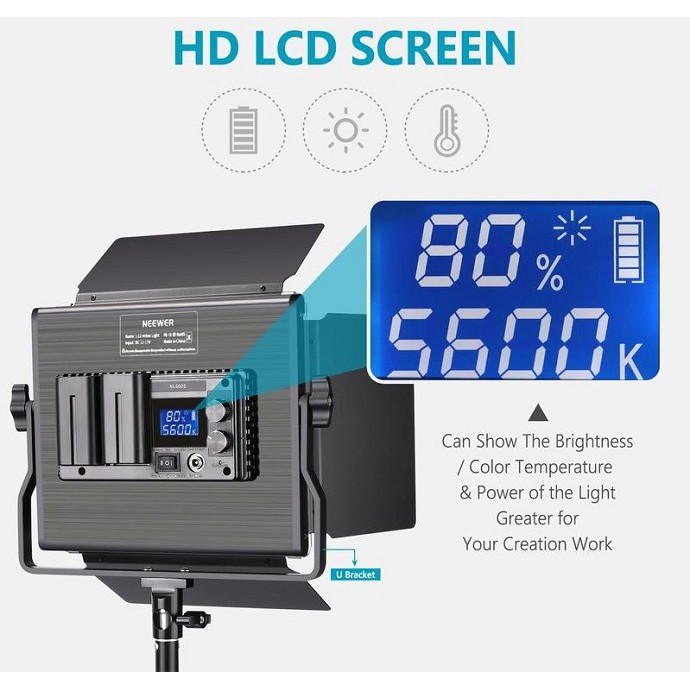 Đèn led quay phim chụp ảnh Neewer NL660S được làm từ hợp kim nhôm cao cấp với 660 chip led SMD chất lượng cao (170 bóng trắng, 170 bóng vàng), chỉ số CRI >96+, nhiệt độ màu từ 3200K – 5600K. Neewer NL660S có màn hình hiển thị LCD giúp thể hiện thông số công suất, nhiệt độ màu, mức pin… một cách rõ ràng nhất. Ngoài ra đèn led quay phim NL660S còn được thiết kế 2 gá pin NP giúp quay phim chụp ảnh ở những nơi không có nguồn điện trực tiếp.THÔNG SỐ KỸ THUẬT: