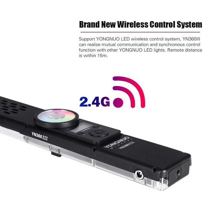 Đèn LED quay phim Yongnuo YN360 III Pro được trang bị điều khiển từ xa độc quyền với bảng điều khiển cảm ứng, thông qua bảng cảm ứng trên điều khiển từ xa, chế độ chiếu sáng và độ sáng có thể được điều chỉnh dễ dàng, tín hiệu được kích hoạt khi chạm vào, chức năng làm mờ chính xác và đáng tin cậy. YN360 III Pro có thể mô phỏng 10 chế độ chiếu sáng bổ sung đặc biệt khác nhau như tia chớp, mặt trời mọc, đèn nhấp nháy của xe cảnh sát, đáp ứng tốt hơn nhu cầu sử dụng của người dùng.THÔNG SỐ KỸ THUẬT: