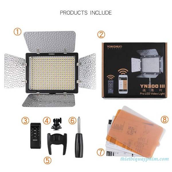 Đèn LED quay phim Yongnuo YN300-III được nâng cấp từ YN-300II, đèn hỗ trợ cổng cắm dây nguồn, kết nối không dây qua điện thoại, và độ sáng mịn đẹp hơn. Đèn có nhiệt độ màu linh hoạt từ 3200K đến 5500k, điều chỉnh bằng dimmer hoặc điều khiển không dây, thuận tiện cho người sử dụng, phù hợp với những nơi thiếu sáng, bổ trợ ánh sáng cho máy ảnh, máy quay phim.