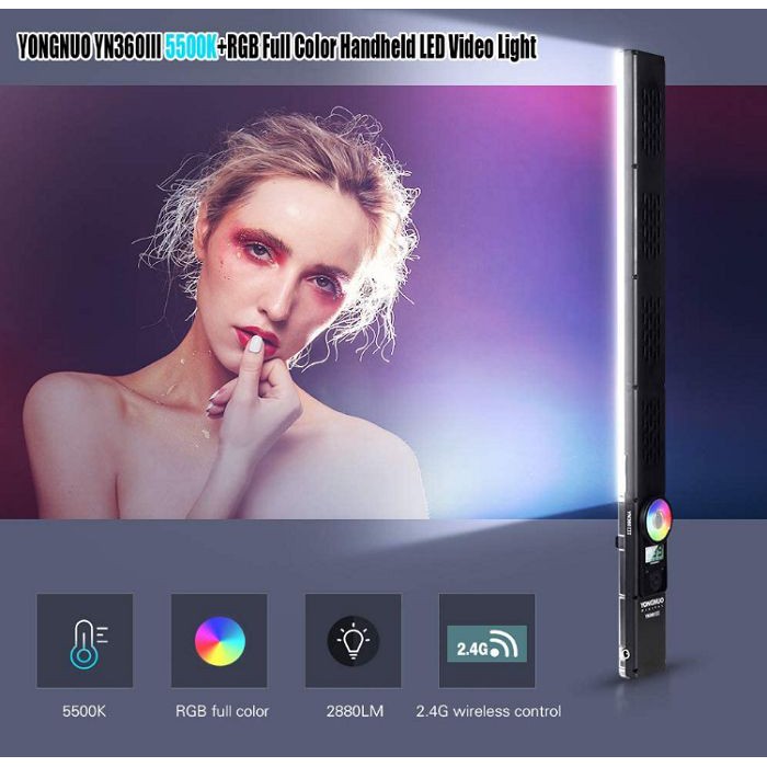 Đèn LED quay phim Yongnuo YN360 III Pro được trang bị điều khiển từ xa độc quyền với bảng điều khiển cảm ứng, thông qua bảng cảm ứng trên điều khiển từ xa, chế độ chiếu sáng và độ sáng có thể được điều chỉnh dễ dàng, tín hiệu được kích hoạt khi chạm vào, chức năng làm mờ chính xác và đáng tin cậy. YN360 III Pro có thể mô phỏng 10 chế độ chiếu sáng bổ sung đặc biệt khác nhau như tia chớp, mặt trời mọc, đèn nhấp nháy của xe cảnh sát, đáp ứng tốt hơn nhu cầu sử dụng của người dùng.THÔNG SỐ KỸ THUẬT: