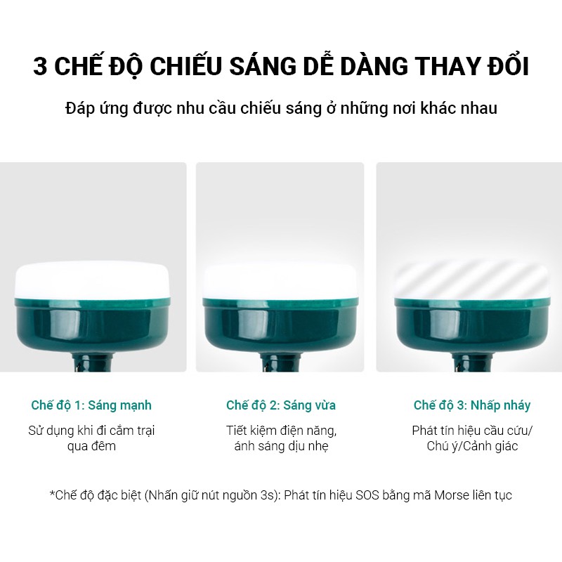 - 3 chế độ sáng mạnh / sáng vừa / nhấp nháy, chế độ nhấp nháy có thể dùng để cảnh báo, nhấn giữ để bật chế độ SOS bằng mã Morse để cầu cứu, bảo vệ an toàn cá nhân