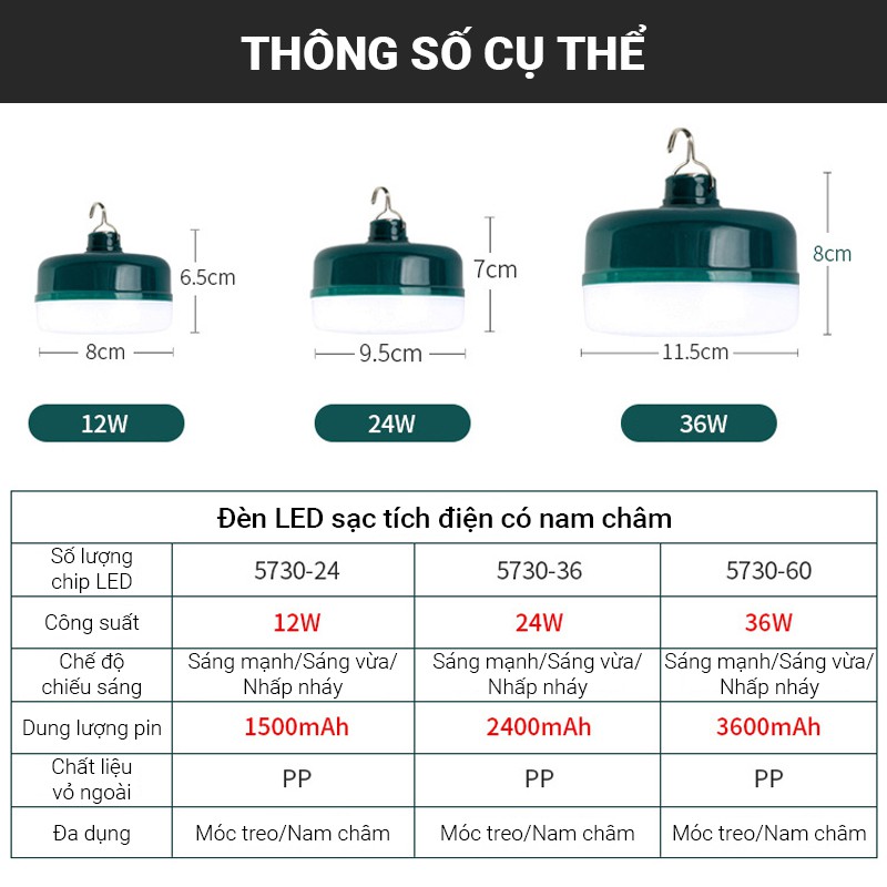 Giới thiệu Đèn LED siêu sáng sạc tích điện C12 công suất 12W/24W/36W có móc treo, đầu hút nam châm, chống nước, chất liệu nhựa PP