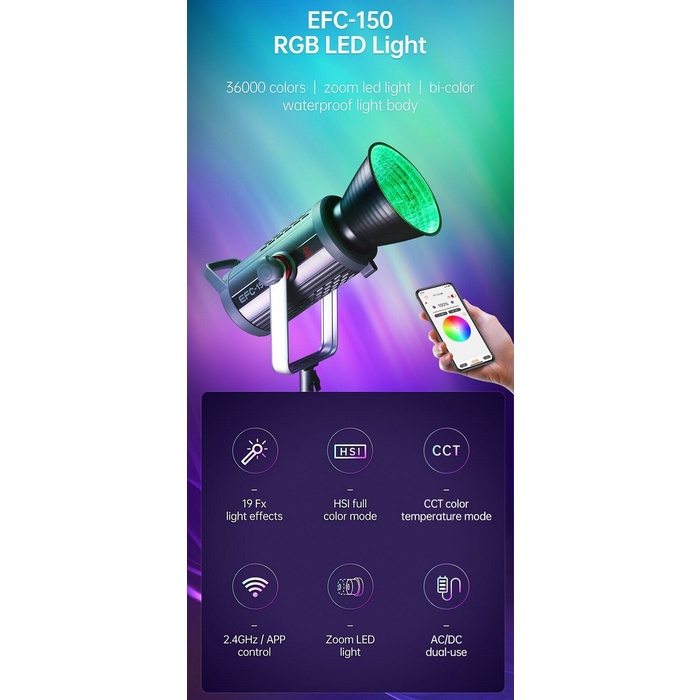 👉: Sản phẩm này đi kèm với 19 loại hiệu ứng ánh sáng FX, hỗ trợ điều khiển từ xa 2.4G / Bluetooth APP, phù hợp với những người dùng chụp ảnh và quay phim.