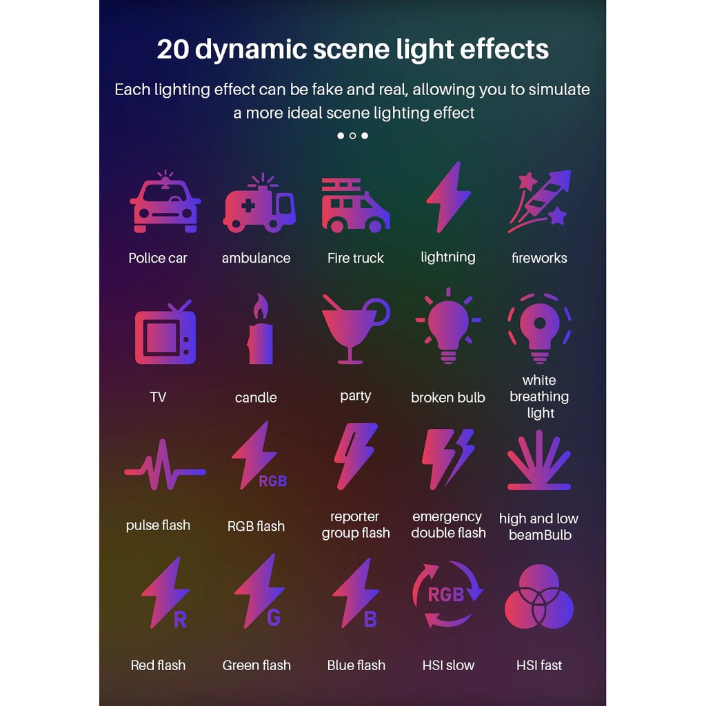 20 chế độ hiệu ứng ánh sáng đặc biệt: 20 hiệu ứng ánh sáng công tắc một phím, bao gồm xe cứu thương, pháo hoa, TV, nến, bữa tiệc, đèn flash xung, đèn flash RGB, đèn nháy đỏ, đèn nháy xanh lá cây, đèn nháy xanh, HSI chậm, HSI nhanh, v.v. bạn với nhiều tùy chọn hơn cho các ứng dụng khác nhau.