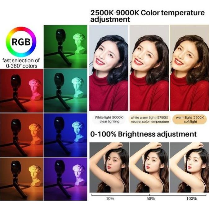 Đèn led quay phim RGB mini tích hợp pin lithium có thể sạc lại 2000mAh, thời gian sạc khoảng 3 giờ, độ sáng tối đa lên đến 2 giờ, độ sáng tối thiểu lên đến 8 giờ. Nó cũng có thể được sạc khi đang sử dụng, không lâu hơn cần phải lo lắng về vấn đề không đủ pin.