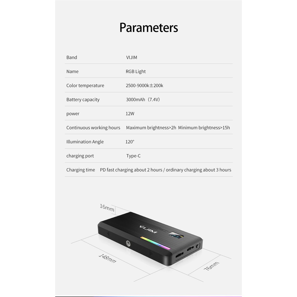 Đèn led video Ulanzi VIJIM VL196 RGB được thiết kế từ hợp kim nhôm CNC gọn nhẹ, kích thước tương đương một chiếc điện thoại smartphone, tiện dụng cho người dùng, đặc biệt là các khách hàng yêu thích sự gọn nhẹ và tinh tế. Đèn VIJIM VL196 RGB tích hợp pin lithium dung lượng lớn 3000mAh mà không lo không đủ năng lượng khi quay.Khi sử dụng Vlog vách ngăn dày nhẹ ánh sáng trực tiếp không chói và nguồn sáng dịu hơn.Đèn led video Ulanzi VIJIM VL196 RGB được thiết kế từ hợp kim nhôm CNC gọn nhẹ, kích thước tương đương một chiếc điện thoại smartphone, tiện dụng cho người dùng, đặc biệt là các khách hàng yêu thích sự gọn nhẹ và tinh tế. Đèn VIJIM VL196 RGB tích hợp pin lithium dung lượng lớn 3000mAh mà không lo không đủ năng lượng khi quay. Khi sử dụng quay Vlog miếng bọc tản sáng dày nhẹ cho ánh sáng trực tiếp không chói và nguồn sáng dịu hơn.
