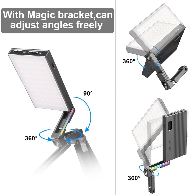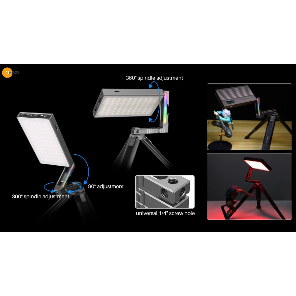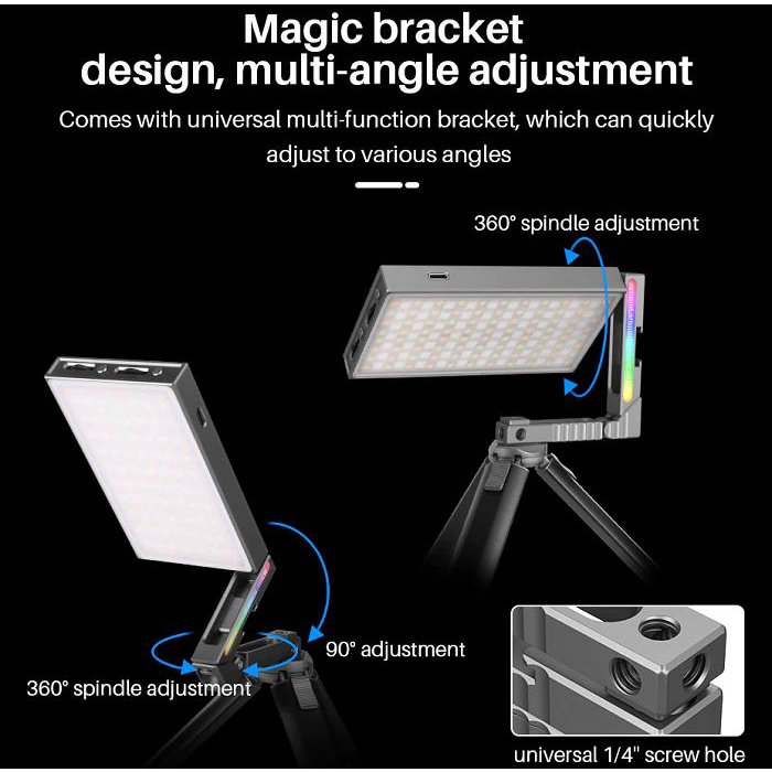 Với thiết kế kim loại nhỏ gọn cầm vừa tay, có nam châm hít lên bề mặt kim loại khác, có phần mount gắn lên tripod ốc 1/4 dể dàng xoay chuyển 360 độ các hướng.