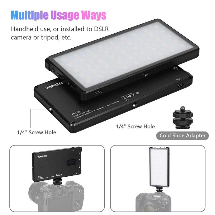 Đèn LED video Yongnuo YN135 RGB là dòng sản phẩm mới 2021 của hãng sản xuất. Đèn được thiết kế từ hợp kim nhôm chắc chắn và nhẹ, công suất đèn lên đến 12w với nhiệt độ màu tùy chỉnh từ 3200K -5600K, RGB. Đèn YN135 được tích hợp pin 5000mAh cho thời gian sử dụng liên tục lên đến 160 phút, kèm theo đó là 14 hiệu ứng ánh sáng đặc biệt phù hớp với quay Vlog, ticktok…Sản phẩm đèn led video chuyên nghiệp YN135 chính hãng Yongnuo được bán tại thietbiquayphim.com với giá tốt nhất.THÔNG SỐ KỸ THUẬT YONGNUO YN135 RGB: