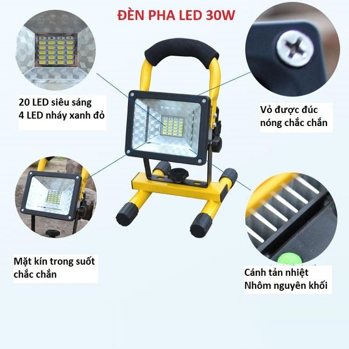 Đèn LED Xách Tay Tích Điện Siêu Sáng 30W là loại đèn xách tay chống nước có ánh sáng trắng chiếu sáng trang trí ngoài trời phù hợp, cấu tạo vỏ đèn chắc chắn với cấp độ bảo về IP65 chống xâm thực của bụi và nước, hơi ẩm. Đèn có góc tỏa lớn, chip LED 24 mắt chiếu cường độ chiếu sáng cao.- Đây là sản phẩm đèn pha LED đa năng với thiết kế tay xách có thể mang theo hoặc là sử dụng khi mất điện. Ngoài 20 bóng led siêu sáng, đèn còn được tích hợp thêm 4 bóng led nháy màu xanh, đỏ đẻ báo hiệu khẩn cấp hoặc dùng trong không khí đèn nháy màu sàn nhảy mua hát khi dã ngoại hoặc trong nhà. Với thiết kế đa năng này sản phẩm sẽ phục vụ tối đa mọi nhu cầu chiếu sáng cho người sử dụng ở bất cứ đâu, bất cứ khi nào!