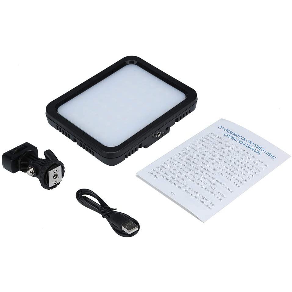 - Đèn video màu ZF-RGB360 có thể được sử dụng làm đèn video thông thường và đèn video màu.Là đèn video thông thường, CCT có thể được điều chỉnh trong khoảng 3200k-5700k.Là đèn video màu, nó có thể cung cấp 360 màu khác nhau Và độ sáng cho ánh sáng màu và trắng có thể được điều chỉnh từ 0-100%. Nó có chế độ màu tự động, nhấn và giữ phím HUE, nó có thể thay đổi màu sắc tự động.