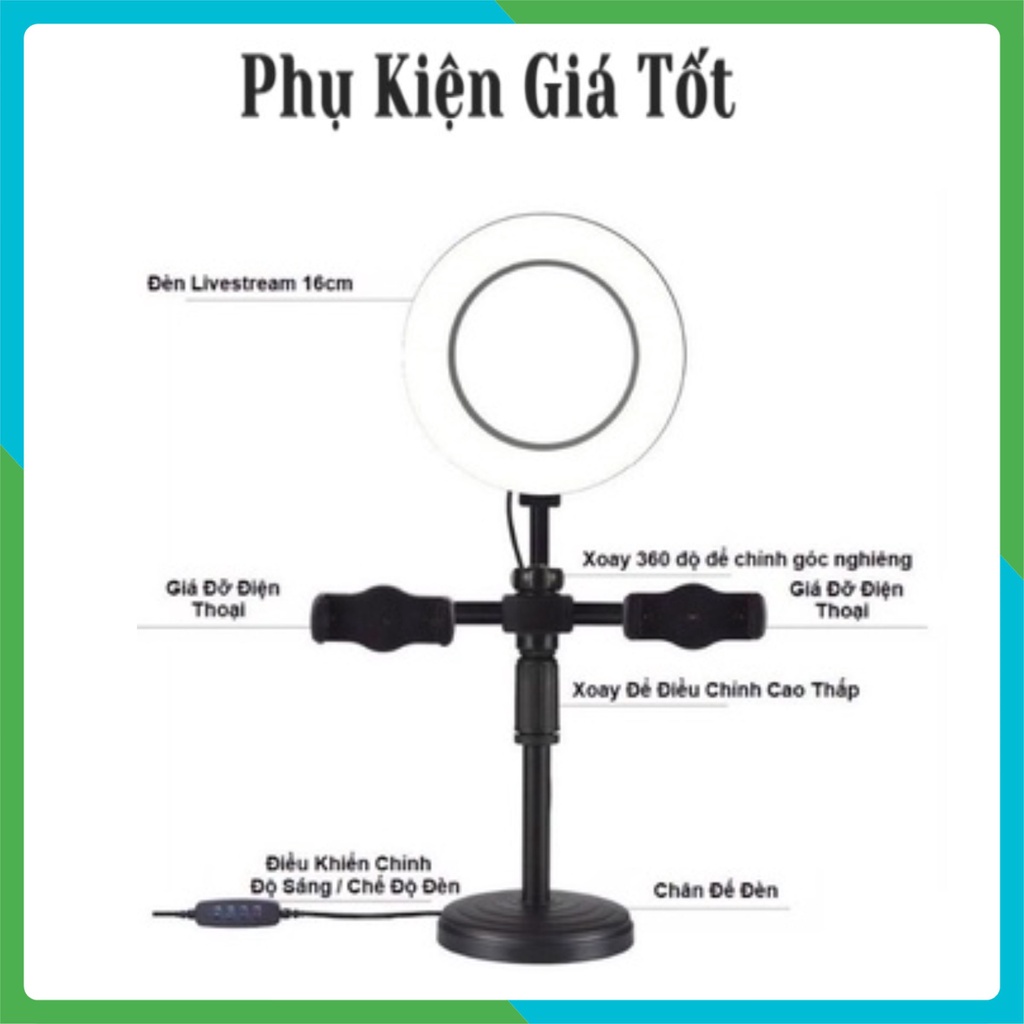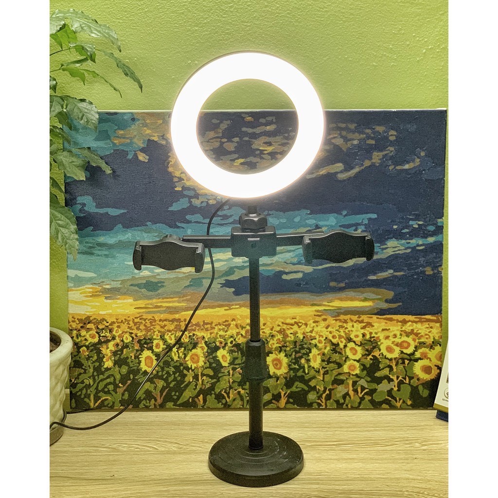 Đèn Livestream 3 in 1 Tích Hợp Giá Đỡ 2 Điện Thoại Có 3 Chế Độ Sáng, Kẹp Điện Thoại Để Bàn Quay Video