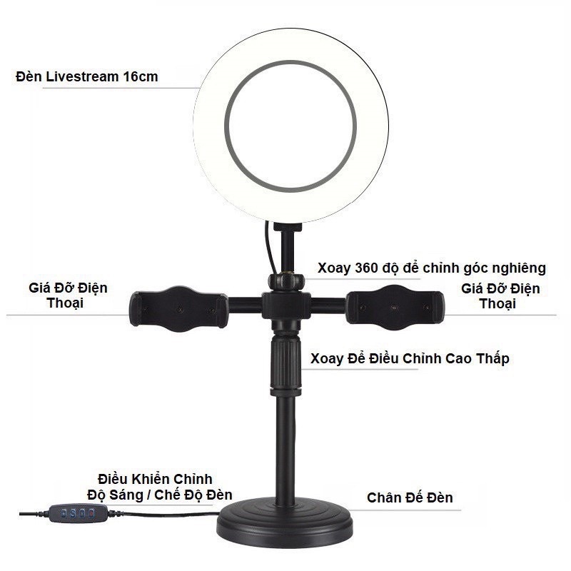 - Bộ sản phẩm bao gồm: 1 đèn, 1 kẹp điện thoại, thân khung và chân đế