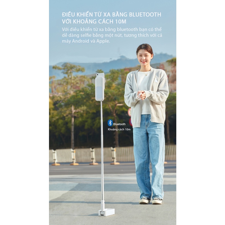 - Điều khiển từ xa bằng Bluetooth khoảng cách 10m, bạn có thể dễ dàng selfie chỉ bằng một nút.