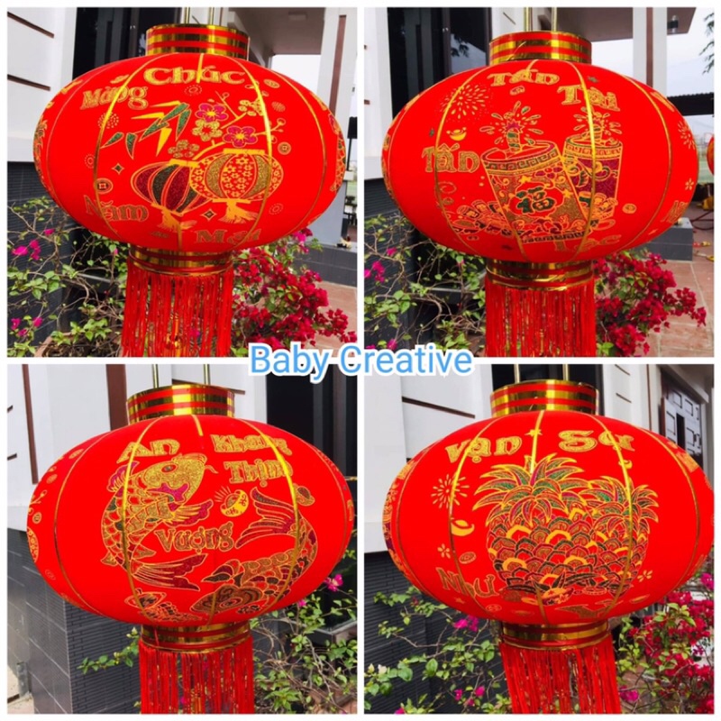 - cầu có chữ Vạn Sự Như Ý, hình con cá chép, chúc mừng năm mới..... Có đế trên và đế dưới. Và thêm quả chuông, một đĩa đỡ dưới quả cầu có tua sợi trang trí thêm phần lộng lẫy cho đèn lồng.