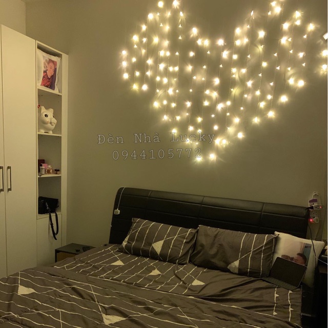- Canh chỉnh lại cho đều. Sau đó cắm điện vào là có ngay 1 bức màn đèn lấp la lấp lánh nè 🤗