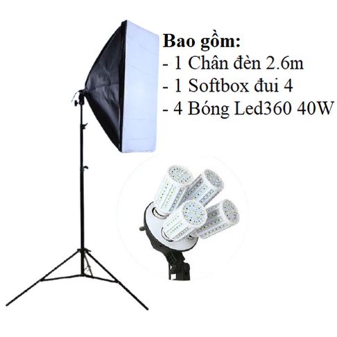 Bộ sản phẩm bao gồm: 1 chân đèn 2m, 1 Softbox 50x70cm đui 4, 4 Bóng đèn Led360 40W