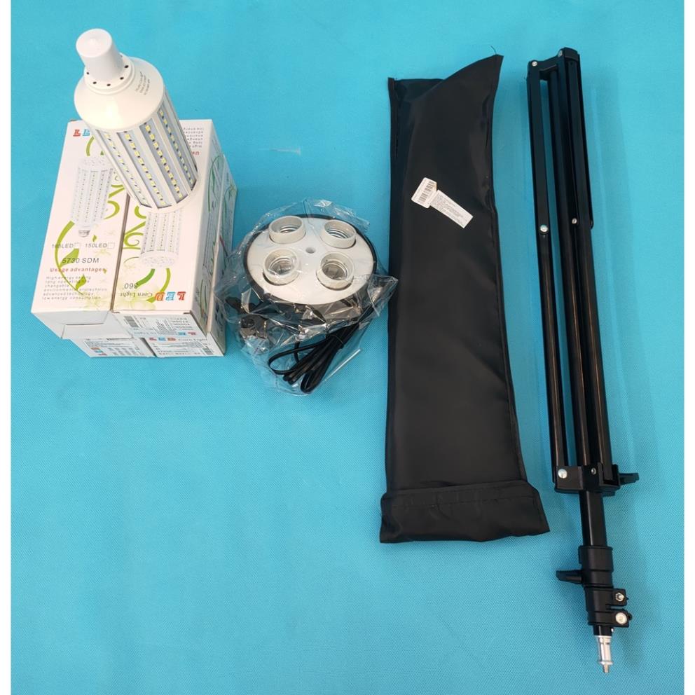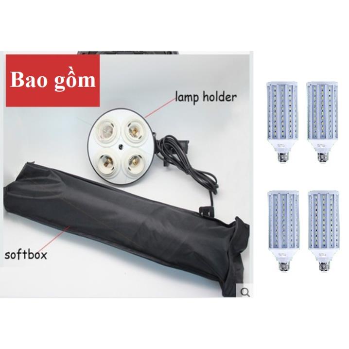 Bộ sản phẩm bao gồm: 1 chân đèn 2m, 1 Softbox 50x70cm đui 4, 4 Bóng đèn Led360 40W