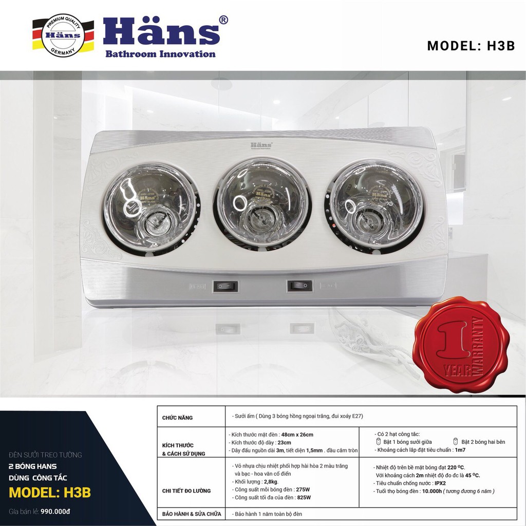 Đèn sưởi nhà tắm Häns là dòng đèn sưởi có mặt đầu tiên tại Việt Nam. Đèn sưởi 3 bóng – H3B được khách hàng tin tưởng sử dụng trong thời gian dài. Với giá cả cực kỳ hợp lý, đây chính là lựa chọn phù hợp nhất để đáp ứng đại đa số người tiêu dùng.- Thông số kỹ thuật của đèn sưởi H3B – Hans:
